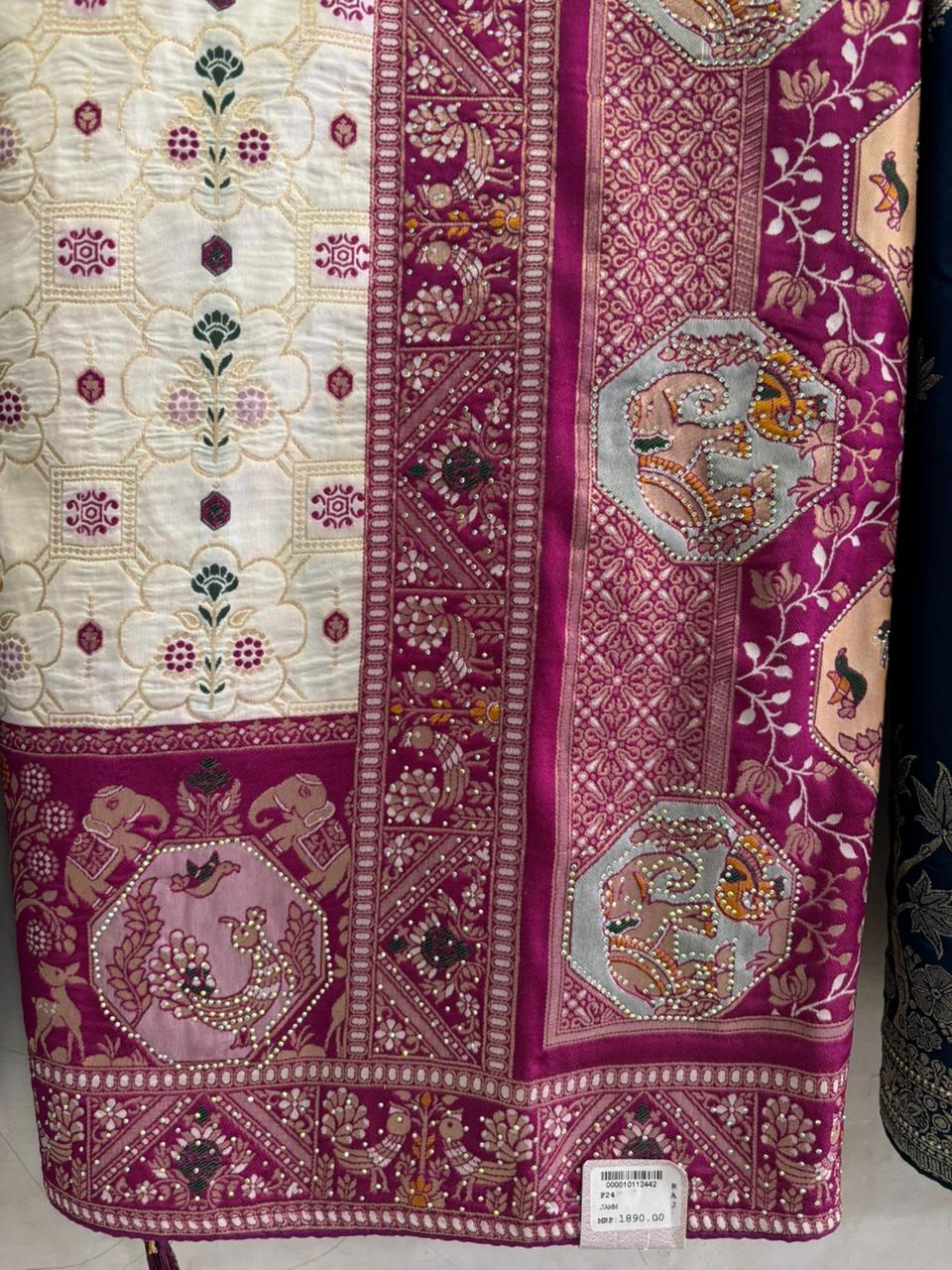 SKU; RF321 RAJ FASHION PASMINA SILK SAREE PREMIUM WHITE WITH PURPAL COLOR